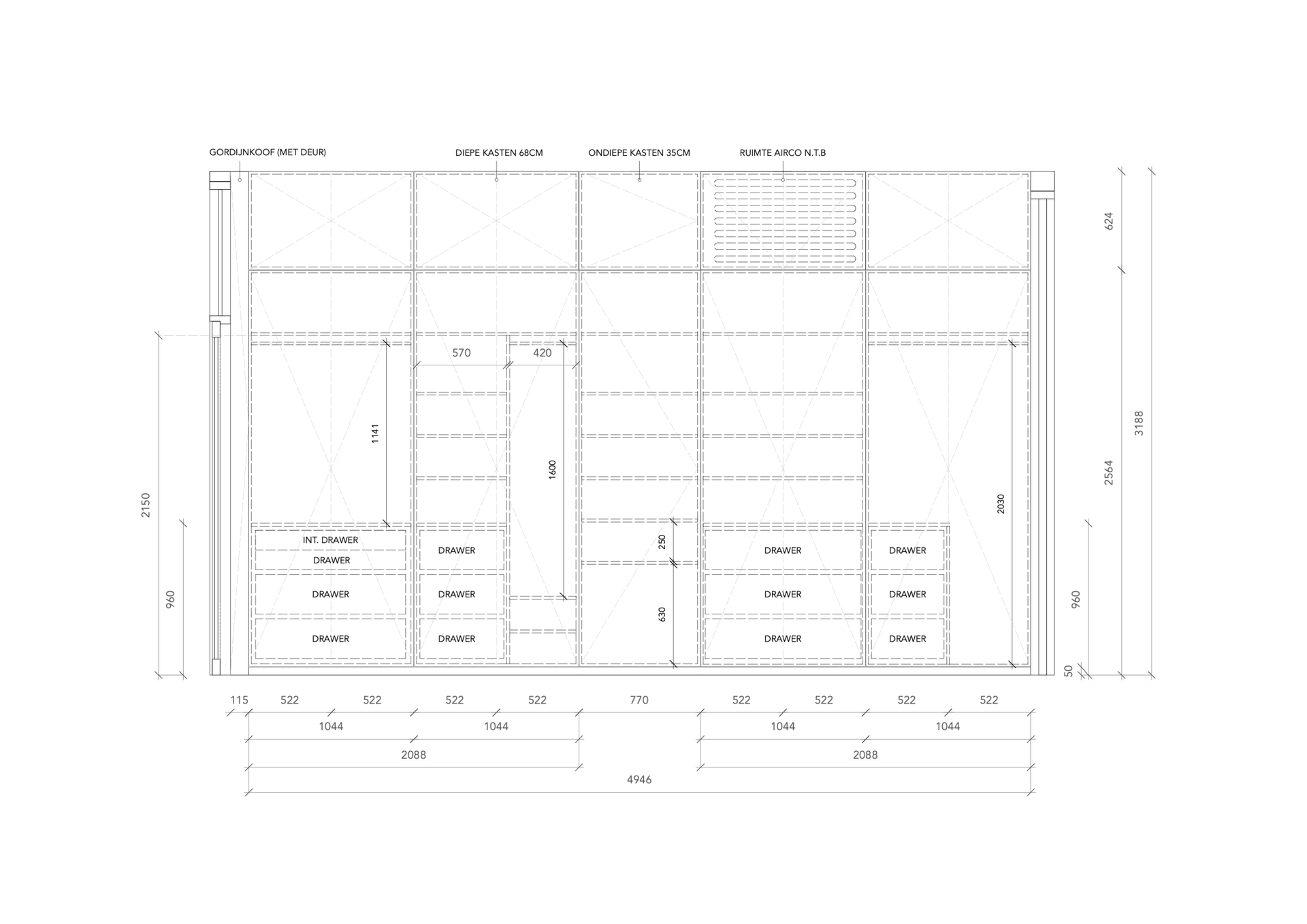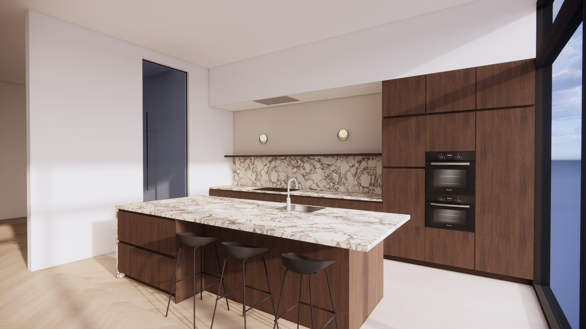 Voor dit interieurarchitectenbureau werk ik diverse tekeningen uit in Vectorworks, op basis van schetsen of aangeleverde modellen (IFC, Revit, DWG of SketchUp). Ik maak plattegronden met indeling en maatvoering, detailtekeningen van maatwerkmeubels, en installatietekeningen voor water, elektra en verlichting. Daarnaast visualiseer ik het ontwerp in 3D, render deze beelden en verzorg de nabewerking om sfeer en materiaalgebruik realistisch te presenteren. Zo ontstaat een compleet en helder pakket voor zowel klantpresentatie als uitvoering door de interieurbouwer.